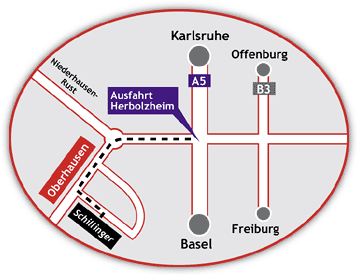 | 1. | Von der Bundesstraße 3 oder von der A5 kommend fahren Sie die Ausfahrt |
